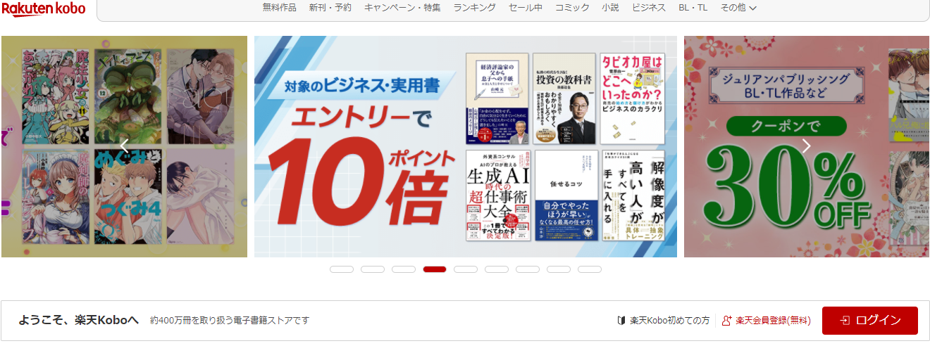 価格やサービス面において、楽天Koboのメリットは、豊富な書籍の取り揃えと割引キャンペーンである。多様なジャンルの作品が揃っており、毎月開催されるクーポンキャンペーンを利用すれば、お得に購入できることが魅力だ。また、楽天ポイントが使えるため、貯まったポイントで本を購入できる。